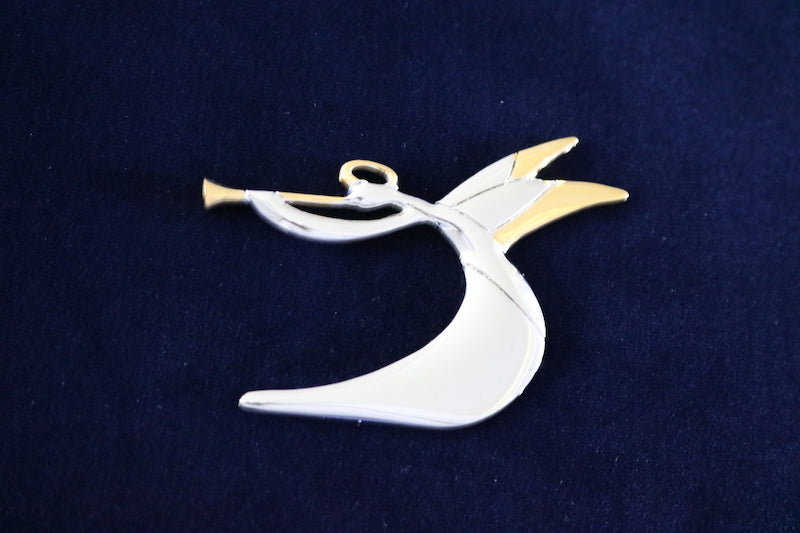 Cazenovia Abroad's Rhodium Angel with trumpet is perfect for anyone who has a modern style but will enjoy the classic angel design. The ornaments bright luster will shine like a bright light and attract any eyes to it. It can be worn as a pendant or hung from a tree.